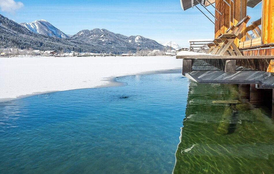 * Genießen Sie unseren Ruheraum direkt am zugefrorenen See mit dem wohl zauberhaftesten Blick auf die verschneiten Berge