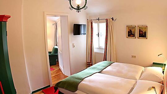 Unser Familienzimmer ist gemütlich eingerichtet und ladet zum Wohlfühlen ein. Ein Doppelzimmer mit Seeblick und einem Kinderzimmer